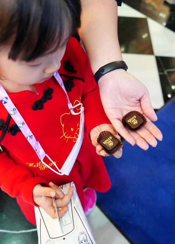 ▼互動遊戲結束後就會掉下來一片75%黑巧克力,小口妹玩得不亦樂乎,三張票都給她玩個過癮!