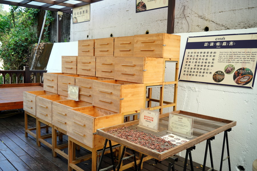 ▼一旁還有可可敲果區、曝曬區等展示,可可經過多道曝曬、烘烤、研磨等多道程序後,才可以製成美味的巧克力!