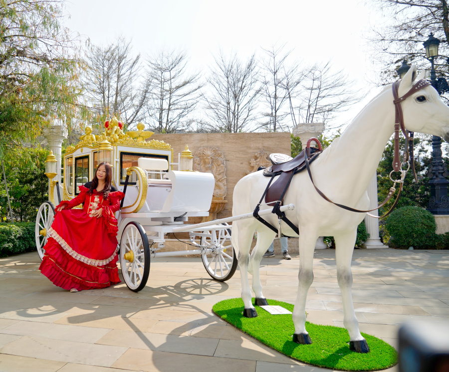 ▼難得變裝的口咩也來挑戰一下歐風貴族,沒想到大紅色的宮廷服非常適合這裡的場景,拍起來超級亮眼~搭配馬車有種要去參加舞會的錯覺!