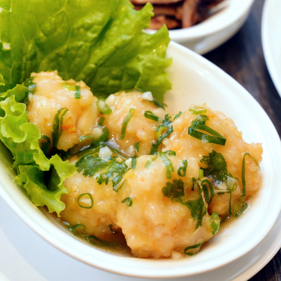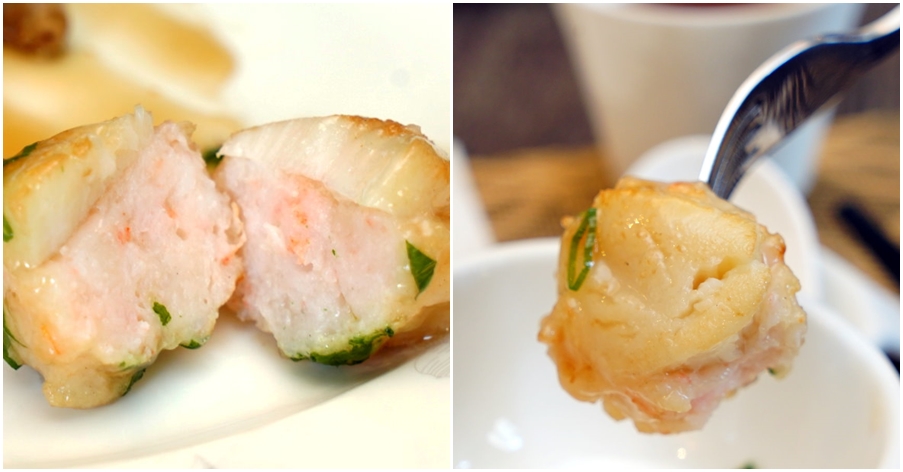 ▼蝦漿將大干貝緊緊包裹其中,先蒸後煎的美味,光看就讓人心動;吃起來又鮮又彈,滿滿海味從嘴裡大噴發,Q彈的蝦泥搭配鮮嫩的干貝,整個好吃到爆炸!