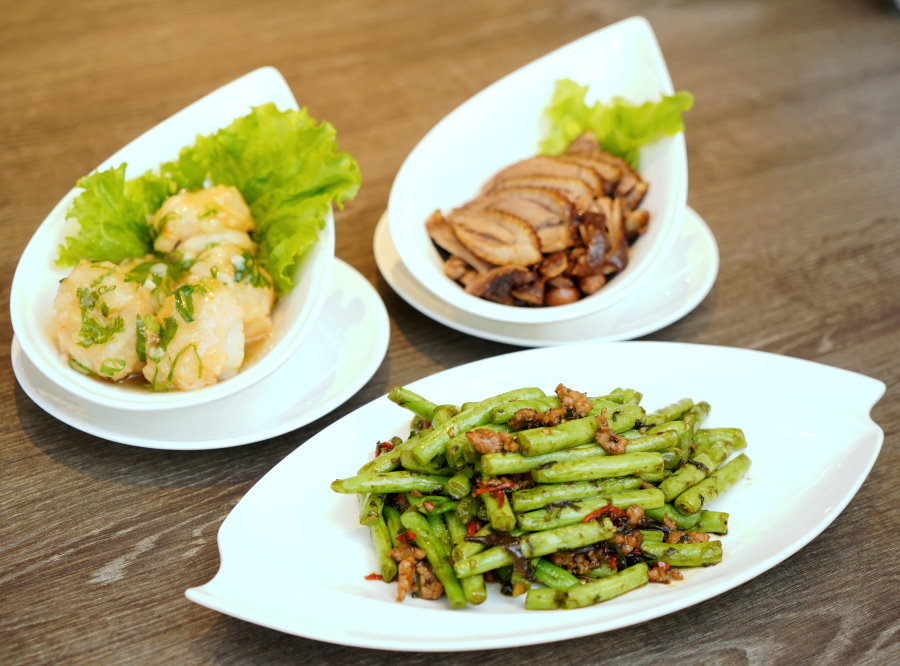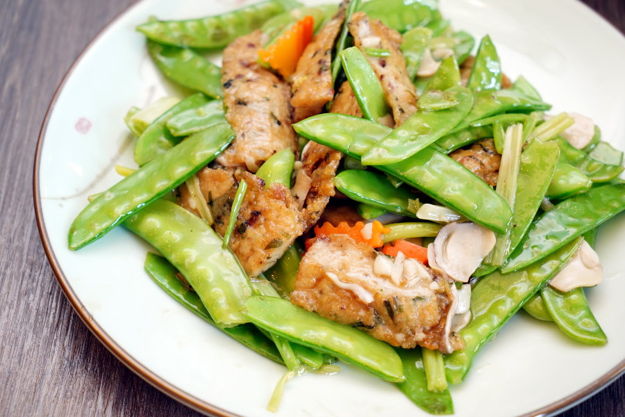 ▼荷芹炒鯪魚鬆,這道可說是香港、澳門朋友最懷念的家鄉菜,採用的是鯪魚(台灣稱為鯁魚),因為刺多所以師傅先拆肉剁泥、混入香菜馬蹄,滾成圓球再入鍋煎炸成魚餅,起鍋後切片再跟荷蘭豆、芹梗一起炒香,形似甜不辣的食材就是切片的魚餅,光聽起來就相當繁瑣;吃起來鹹香又帶點Q滑滋味,搭配蔬菜、菇類一同快炒,更增添清爽口感!