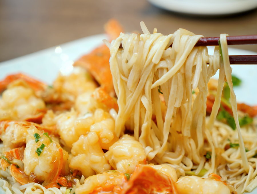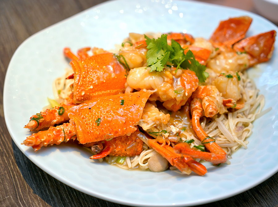 ▼伊麵相傳為清代官員伊秉綬所發明,又稱為伊府麵,也有人稱為意麵,理論上就是由麵粉、雞蛋加水下去攪勻製成麵條,油炸後曬乾保存;伊麵吸附醬汁精華後吃起來香Q滑順,帶有麵香與醬香,甘醇鹹香的滋味很涮嘴!以往我們對於龍蝦搭配的麵體都沒有太大期待,但這裡裹上醬汁的麵條相當好吃,讓人忍不住一口接一口~