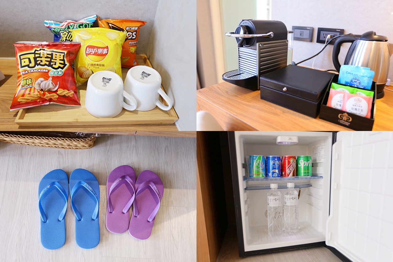 ▲房內提供有多款零食、汽水飲料、膠囊咖啡、沖泡茶包、可帶走的夾腳拖,這樣的陣仗就讓人感覺超窩心。現在很少旅宿會準備的這樣齊全了。