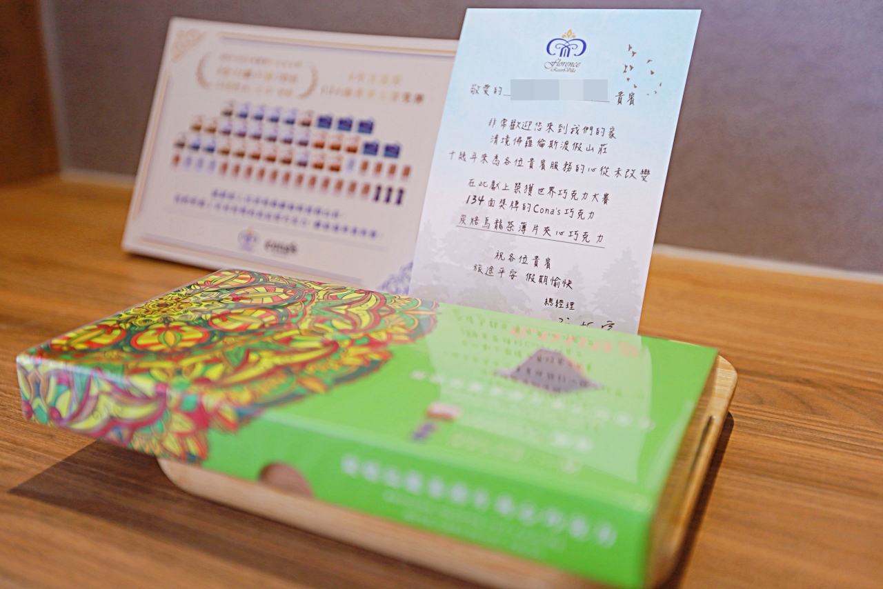 ▲最讓人眼冒愛心的就是這個!直接送給旅客一盒迎賓禮「Cona’s妮娜巧克力 炭焙烏龍茶薄片夾心巧克力」。有吃過Cona’s妮娜巧克力的薄片夾心巧克力就知道有多好吃,這裡完全不手軟的直接送一盒當客房迎賓禮。
