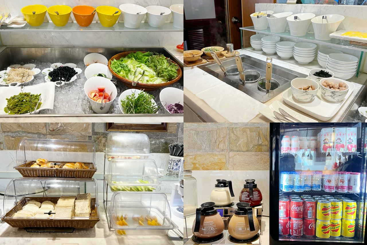 ▲沙拉吧、擔仔麵、麵包、水果、飲品、熱食、湯品、飲料,餐點選擇豐富。