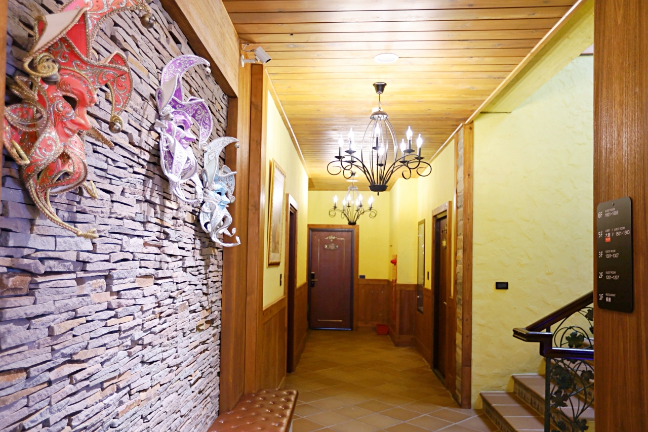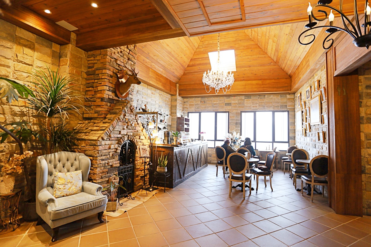 從踏進「義式鄉村城堡」開始有種錯覺,瞬間身處在歐洲一樣,從大廳櫃檯到一旁的咖啡廳、歐式壁爐、斜屋頂設計,充滿設計感的空間,窗外就是無敵山景。原來因為地勢的關係,大廳位置其實是在五樓,一樓是餐廳,供應早餐、晚餐。客房位在2樓到6樓,有雙人房、四人房的選擇。「義式鄉村城堡」共有14間主題房,上網看了房間介紹,每一間都很美,真的是很難抉擇。