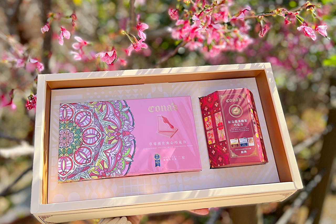▲「草莓薄片夾心+紅烏龍茶榛果巧克力」禮盒,是近期推薦的組合。紅烏龍茶榛果巧克力中間是選用土耳其進口榛果,外層用梨山紅烏龍茶混合比利時白巧克力,濃郁的茶香配上巧克力,層次豐富,這支產品也獲得世界巧克力大賽銀牌獎。