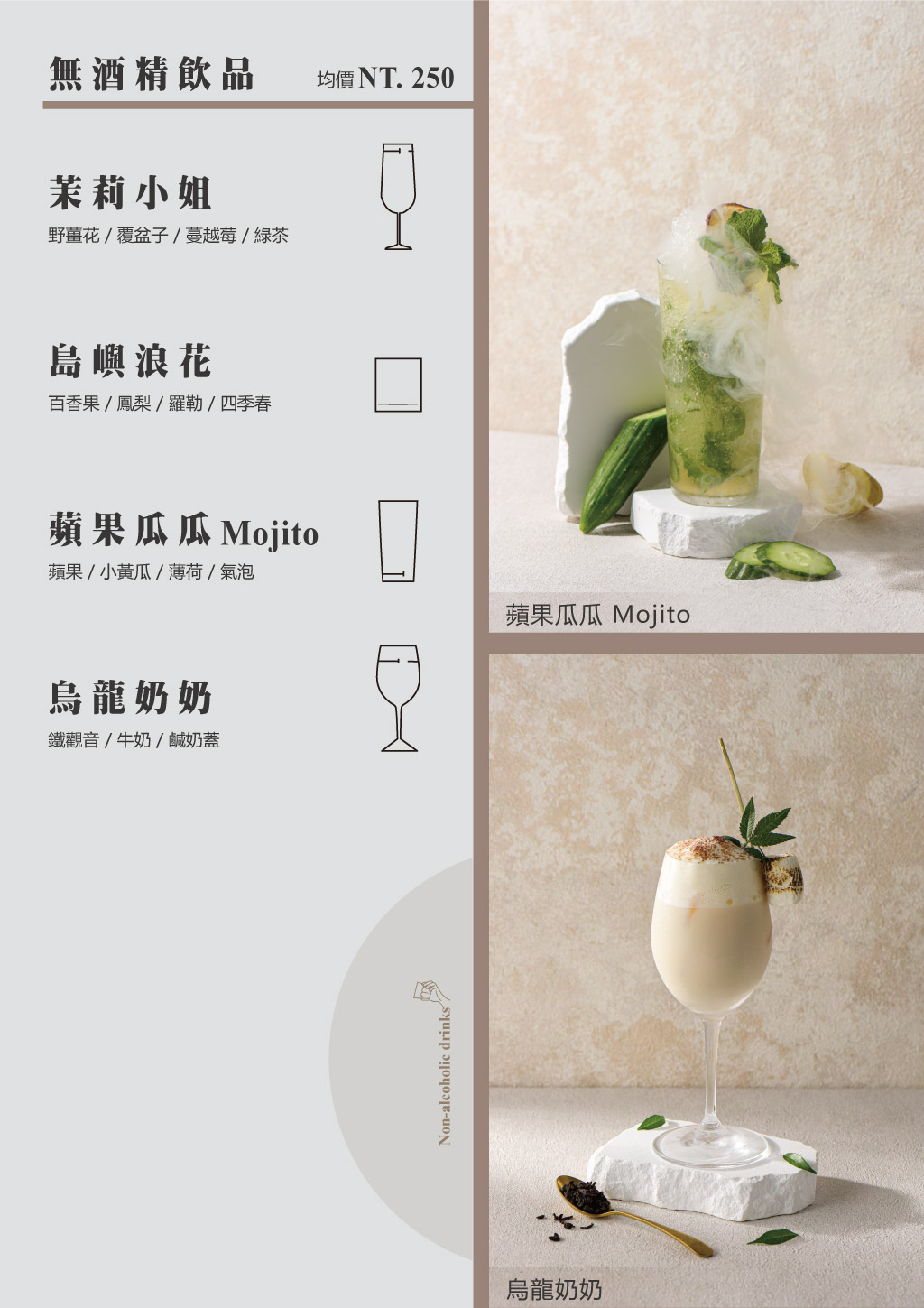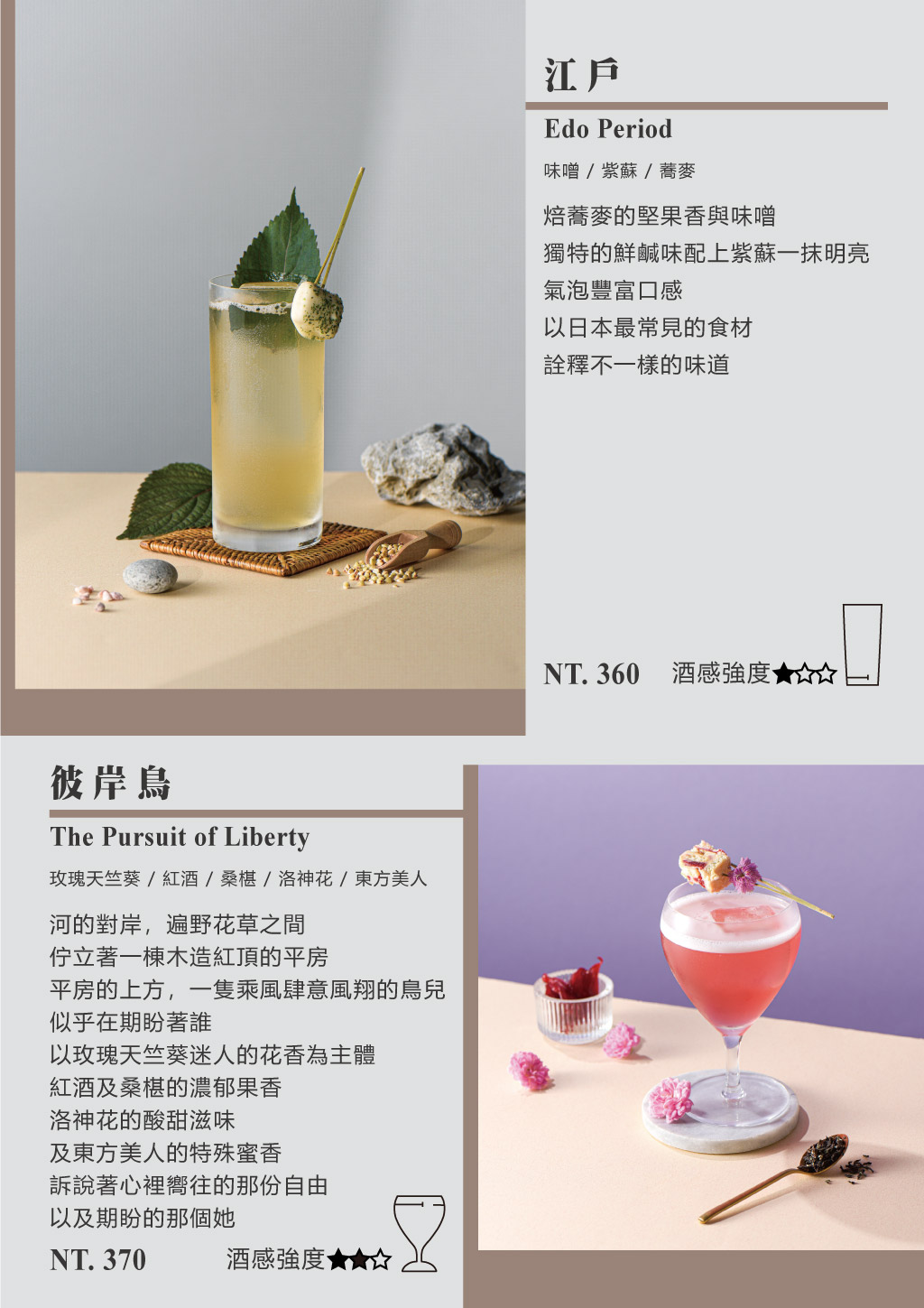 ▲左邊這杯為島嶼浪花,是一杯非酒精飲料,以百香果、鳳梨、羅勒及四季春調和而成,喝起來為熱帶水果香氣超棒,右邊這杯為彼岸鳥,是一杯創意調酒,以玫瑰天竺葵、紅酒、桑椹、洛神花及東方美人調和而成,酸甜滋味超適合女性朋友的喔!(警語:喝酒不開車開車不喝酒!)