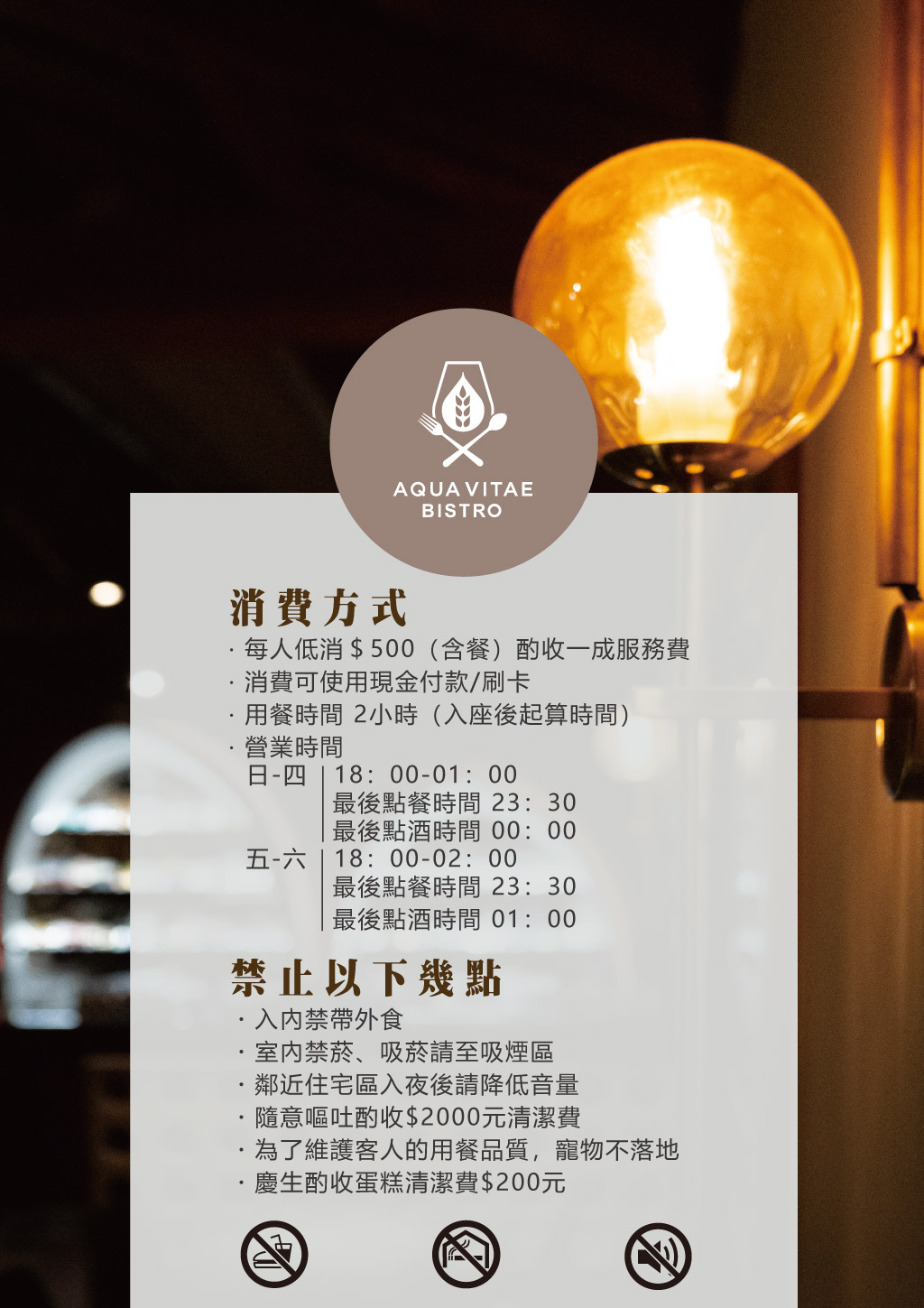 ▲AQUA VITAE BISTRO餐酒館提供調酒及非酒精飲品,還有義大利麵、炸物、排餐等美味料理,超適合下班後的好友同事聚會。