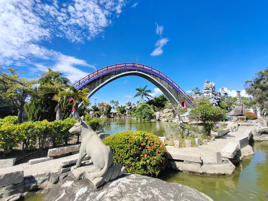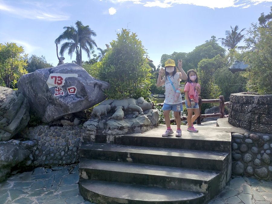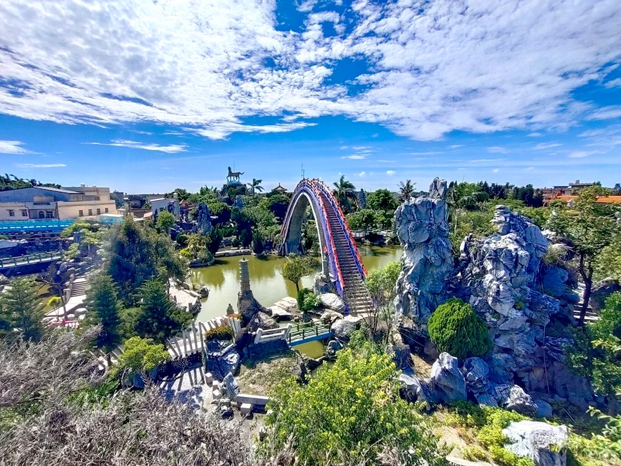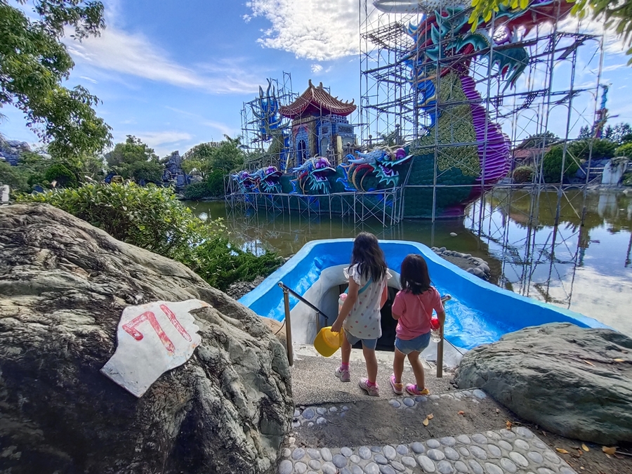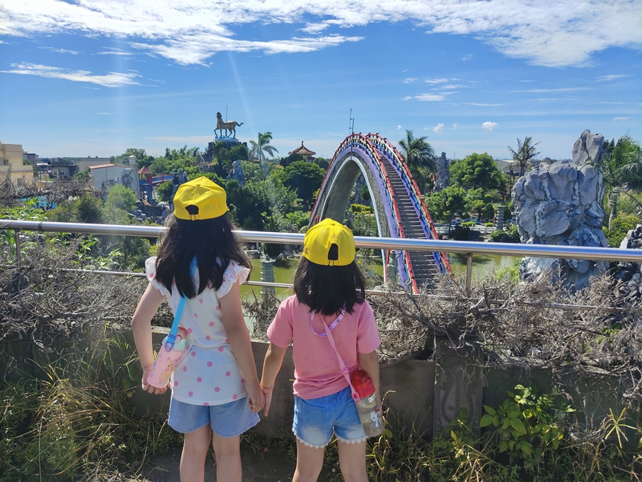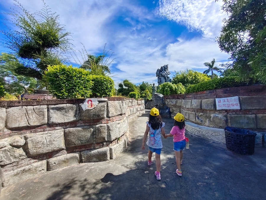 雲林景點「五年千歲公園」是全台面積最大的寺廟主題公園,免門票、好停車,佔地足足有2公頃、共73個景點,有點像在走大型實境迷宮的概念,跟著指標走準沒錯;其中包含不少奇山異石、神仙雕像,甚至還有大恐龍、九龍巨船及最著名的彩虹摩天大橋,很適合邊走邊拍,逛起來其實挺有趣的!我們是環島回程順路來訪,小倆口來到這裡根本當作闖關遊戲在走,一心只想把全部的號碼收集完畢,有考慮過爸媽想走捷徑的心情嗎(笑)~~正常來說全部走完大概會花費90分鐘,托小倆口的福氣,我們只花了60分鐘就闖關成功,且小倆口上車後立刻秒睡,真不愧是孩子的放電天堂!