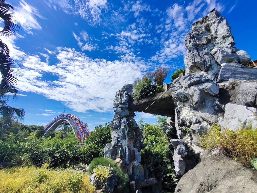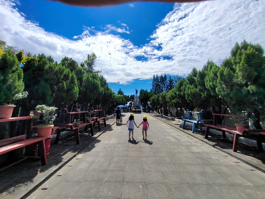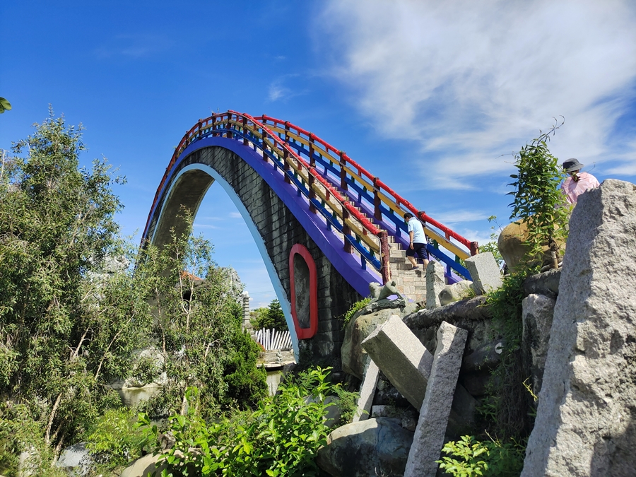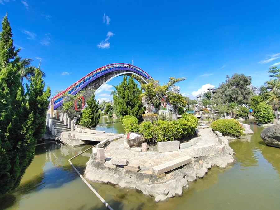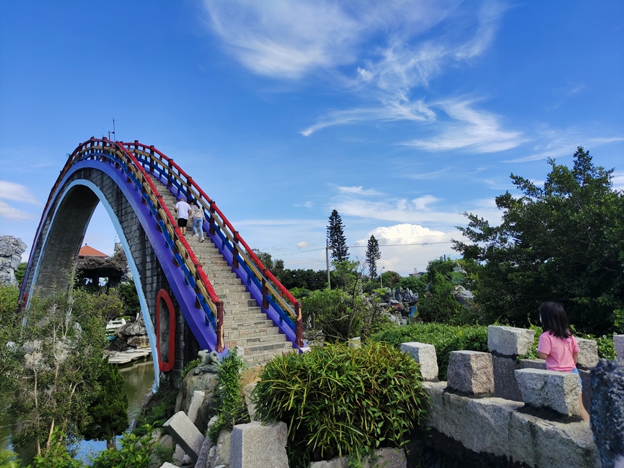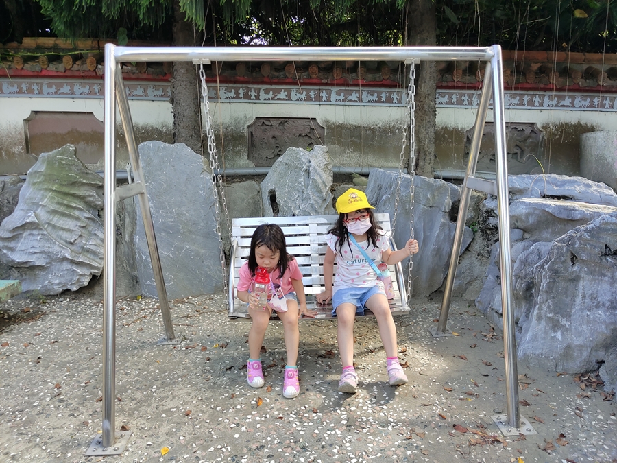 雲林景點「五年千歲公園」是全台面積最大的寺廟主題公園,免門票、好停車,佔地足足有2公頃、共73個景點,有點像在走大型實境迷宮的概念,跟著指標走準沒錯;其中包含不少奇山異石、神仙雕像,甚至還有大恐龍、九龍巨船及最著名的彩虹摩天大橋,很適合邊走邊拍,逛起來其實挺有趣的!我們是環島回程順路來訪,小倆口來到這裡根本當作闖關遊戲在走,一心只想把全部的號碼收集完畢,有考慮過爸媽想走捷徑的心情嗎(笑)~~正常來說全部走完大概會花費90分鐘,托小倆口的福氣,我們只花了60分鐘就闖關成功,且小倆口上車後立刻秒睡,真不愧是孩子的放電天堂!