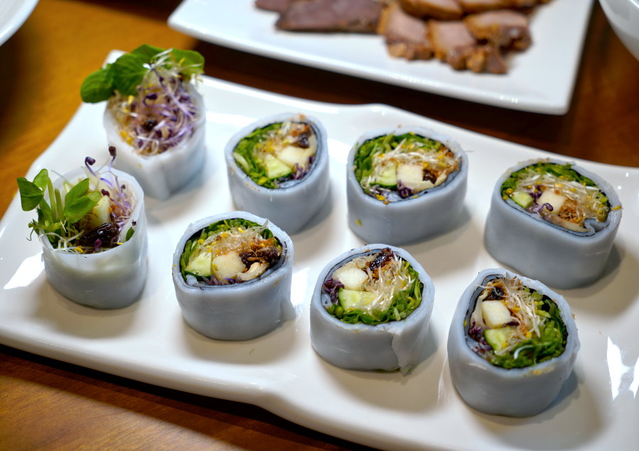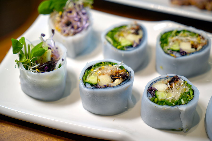 ▼粄條手捲,這道算是比較創意的粄條料理,採用純米粄條包裹有機苜蓿芽、有機豌豆苗、蘋果、小黃瓜、葡萄乾、香鬆、海苔等配料,看起來渾圓又討喜!