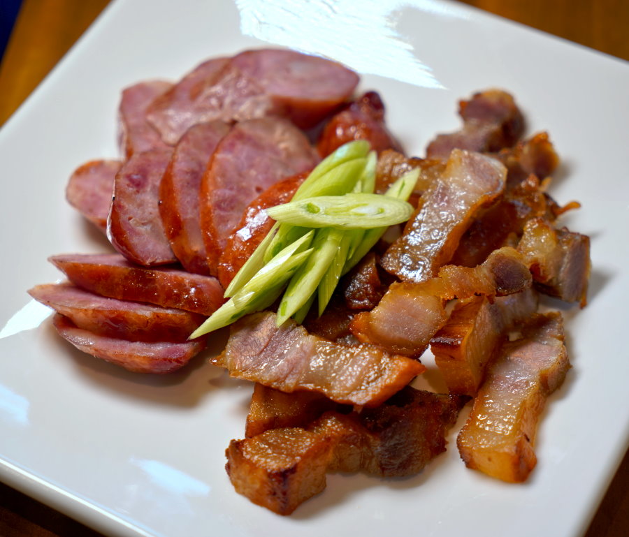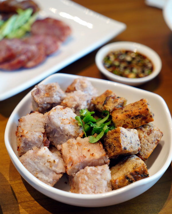 ▼鹹豬肉摎煙腸,也就是鹹豬肉跟香腸的拼盤,自製鹹豬肉採用傳統客家製法,使用黑毛豬肉搭配蒜、酒、鹽巴下去製成,沒有添加閩南人較為熟悉的胡椒味,吃起來就是很純粹的鹹香、酒香,味道不會過於死鹹,帶點Q彈紮實的口感,細細咀嚼更能吃出食材的單純味道!