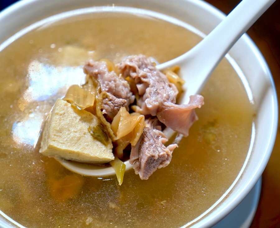 ▼覆菜湯,採用在地日曬手作覆菜,搭配香菇、黑毛豬肝連肉、凍豆腐,也是很有在地風味的湯品;覆菜其實也就是我們常聽到的福菜,因製作發酵過程需將菜桶倒覆,所以稱為覆菜,後來取其諧音又稱為福菜!喝起來帶有獨特的酸香甘甜,味道不會過於濃重,搭配軟Q的肝連肉、柔軟飽水的凍豆腐,清爽又順口!