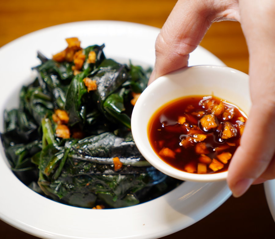 ▼蘸紅菜,採用在地小農栽種紅菜,簡單輔以老薑、醬油提味,吃起來細嫩又甘甜!