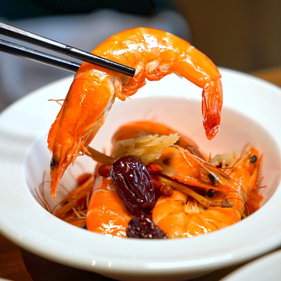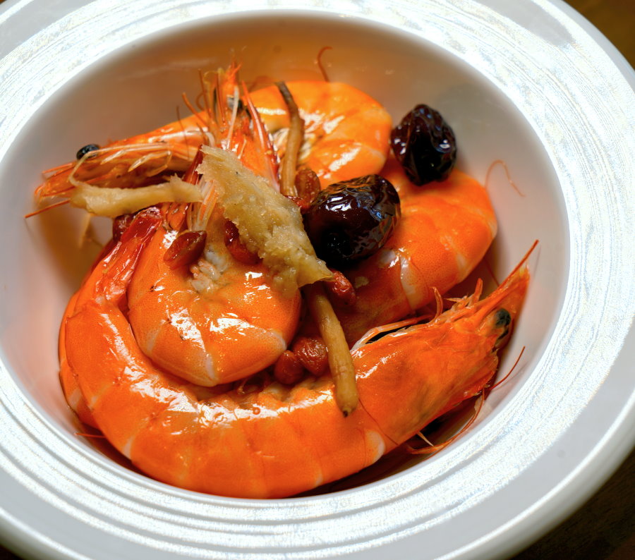 ▼參酒蝦公,使用白蝦搭配當歸、人參、枸杞、紅棗、酒等下去烹煮,聞得到淡淡的藥膳香氣!