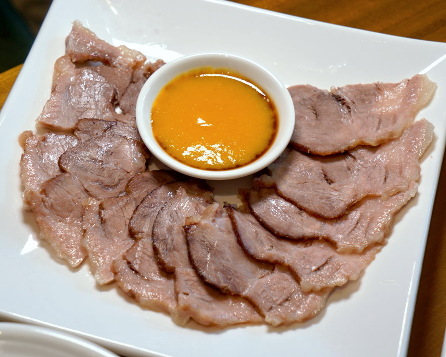 ▼梅花肉不僅沒有一絲豬癬味,柔軟又帶點彈性的肉質,吃得到本身肉質的甜美,搭配酸甜開胃的桔醬更是超合拍,提襯味蕾又爽口!