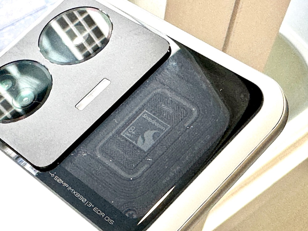 realme GT3 外型上最特別的就是背面的相機模組旁邊有一個半透明窗口,透視設計能夠直接看到處理器晶片裝飾、NFC 天線和創新的 C 形 RGB 燈效。