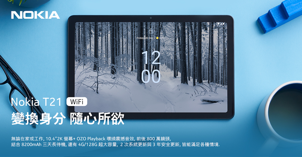 Nokia 宣布 T 系列全新平板電腦 Nokia T21 將於 3 月 7 日正式登台!Nokia T21 搭載 10.4 吋 2K 螢幕以及 800 萬像素前後鏡頭,外觀設計上 Nokia T21 機身使用鋁合金和 60% 再生塑膠打造,並支援延伸第二螢幕以及 Wacom 觸控筆特色,建議售價為 NT$7,990 元,3/7-3/31 早鳥優惠價為 NT$7,490 元。