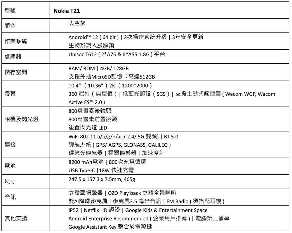 Nokia T21 規格上為 10.4 吋 2K 螢幕、紫光的 T612 平台、4GB RAM、128GB ROM,可以外接 microSD 記憶卡最高至 512GB,前後鏡頭皆為 800 萬畫素,8200mAh 電池容量,支援人臉解鎖。