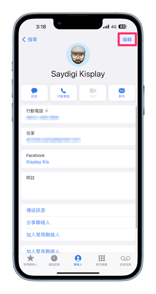 步驟 1. 選好並打開要設定白名單的聯絡人:「電話」>>>「聯絡人」>>> 找到那個人的聯絡名片後選擇右上方的「編輯」。