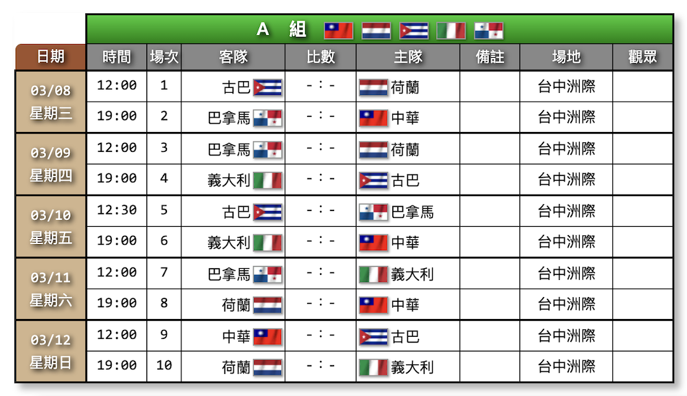 - 3/08 (三) 19:00 巴拿馬 vs 中華 12:5