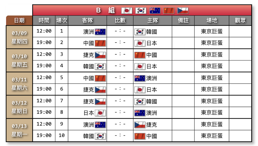 - 3/10 (五) 11:00 捷克 vs 中國 8:5