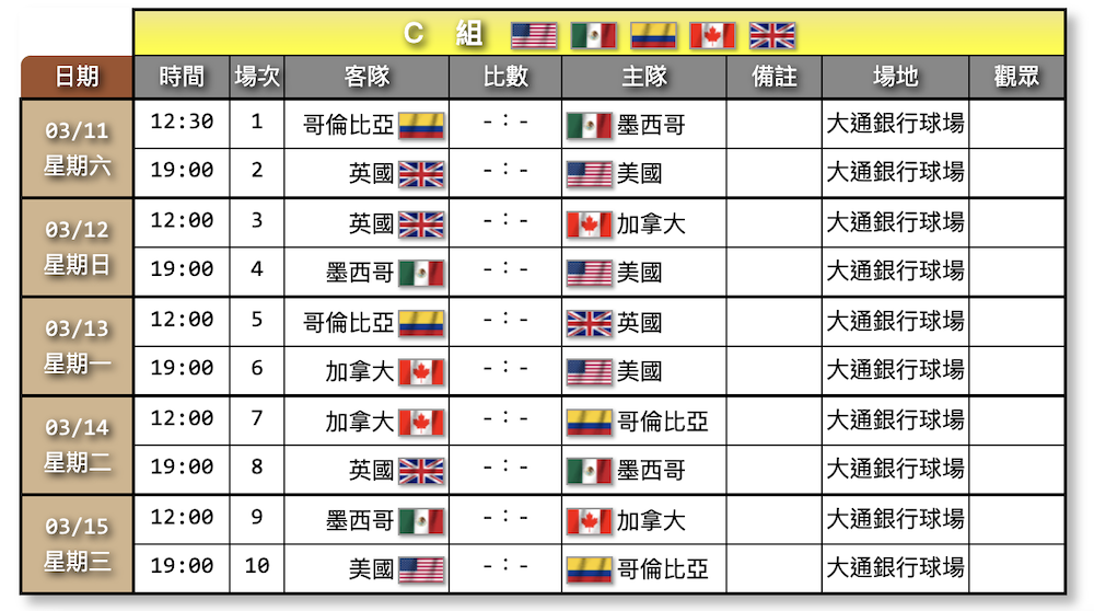 - 3/14 (二) 12:00 加拿大 vs 哥倫比亞
