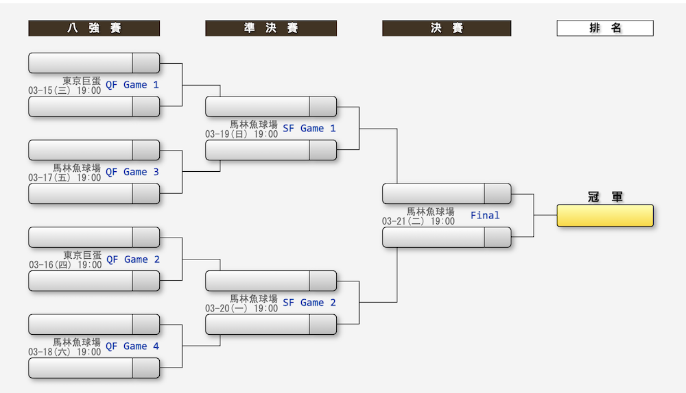 - 淘汰賽 4強 3/20(一)、3/21(二)