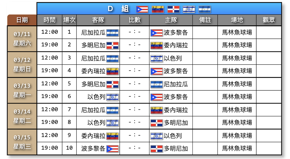 - 3/14 (二) 12:00 尼加拉瓜 vs 委內瑞拉