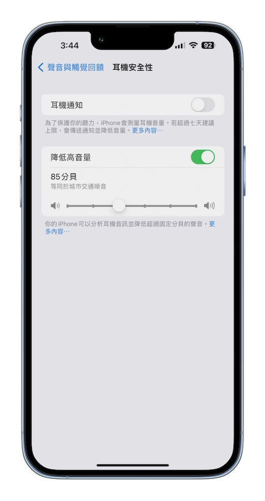 - 降低高音量: 如果想要設置耳機音量限制,可前往「設定」>>>「聲音與觸覺回饋」(iPhone 7 及後續機型) 或「聲音」(較早機型) >>> 選擇「耳機安全性」>>> 開啟「降低高音量」,並將滑塊拖移至合適的分貝數。