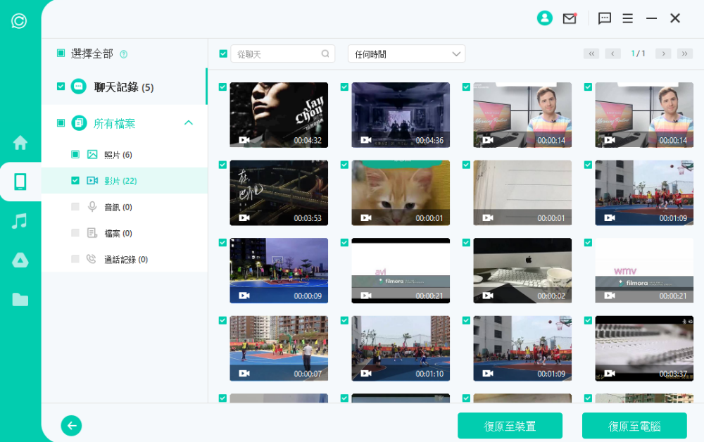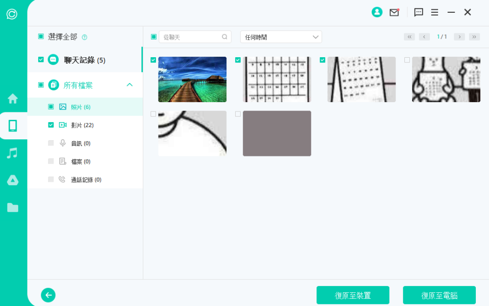 - 步驟 4:確認數據無誤後,勾選想要復原的內容,然後點選「復原至裝置」或「復原至電腦」即可。