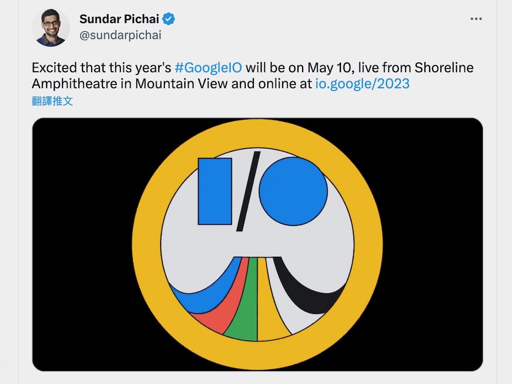 稍早 Google 執行長 Sundar Pichai 於 twitter 上預告將於 5 月 10 日(三)舉辦 2023 Google I/O!