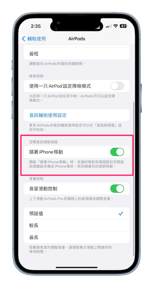步驟 3. 在「設定」中依序進入「輔助功能」>>>「AirPods」,開啟「隨著 iPhone 移動」。