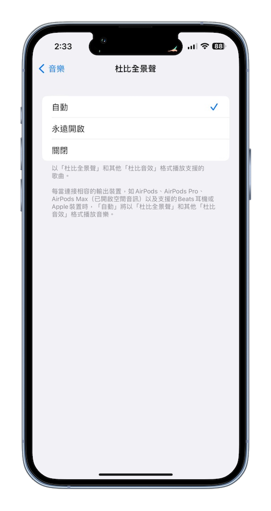步驟 1. 依序打開「設定」>>>「音樂」>>>「杜比全景聲」,選擇「自動」。這表示當我們連接支援空間音訊的耳機時,就會自動使用「杜比全景聲」來播放。如果我們要使用有線耳機的話,這邊就要選擇「永遠開啟」。