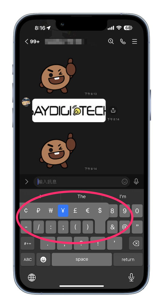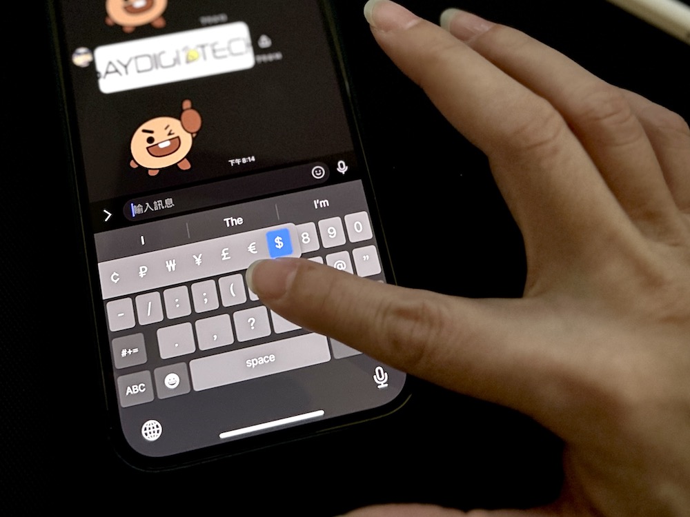 鍵盤上的標點符號我們都知道怎麼切換,不過原來在標點符號中,我們還可以透過「長按」來喚出其他特殊用途的符號,像是日幣的 ¥、韓元的 ₩ 、歐元的 € 等幣別能在長按 $ 符號後喚出; 西班牙文中的 ¡、¿ 也能在 !、? 上長按後看到,長按數字鍵還會有 (1)、① 這種符號可以選擇。