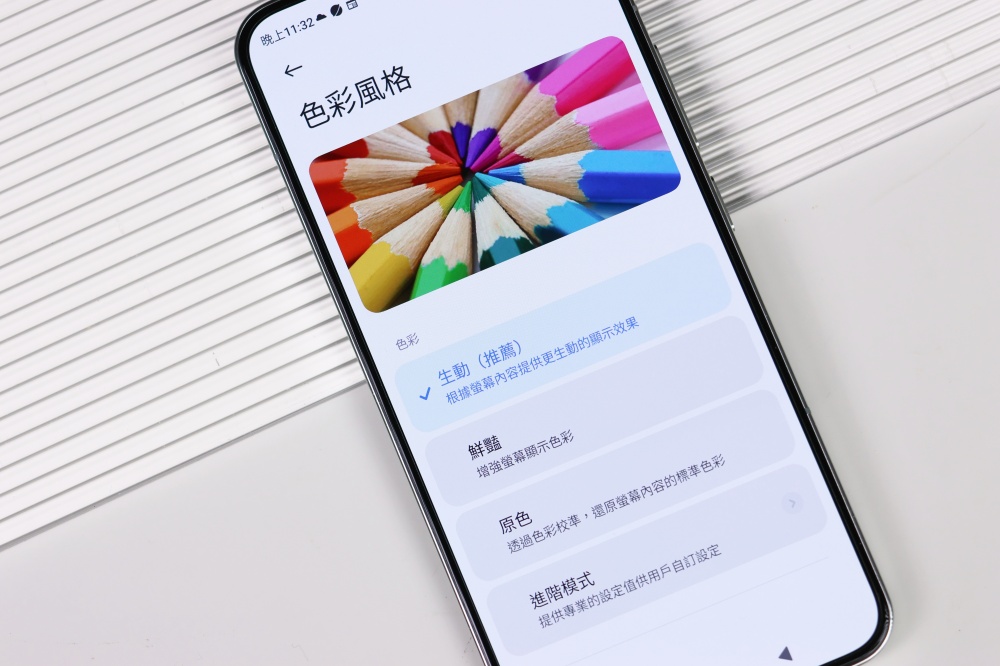 內建的螢幕設定可以調整色彩風格,建議直接套用生動模式即可,但如果特別偏好鮮豔的顯示效果或甚至自訂顯示風格也提供調整的彈性。