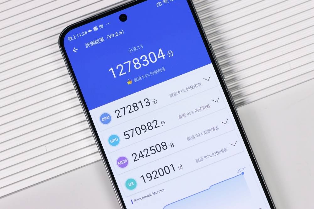 效能表現我們直接透過實測數字給大家參考,安兔兔 V9.5.6 得到超過 127 萬分的成績,而且跑分時溫控表現也很好。