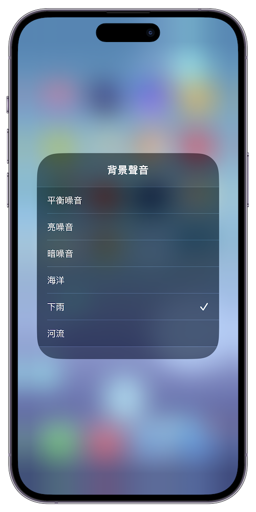 步驟 2. 在「控制中心」裡點開「聽力」後,點選「背景聲音」,就會看到 iPhone 內建了「平衡噪音」、「亮噪音」、「暗噪音」、「海洋」、「下雨」、「河流」共 6 種白噪音能夠選擇。