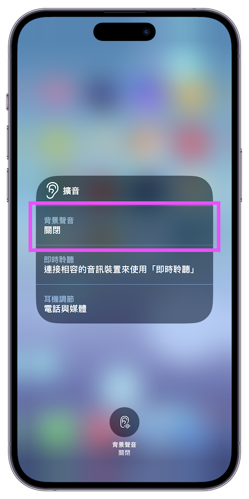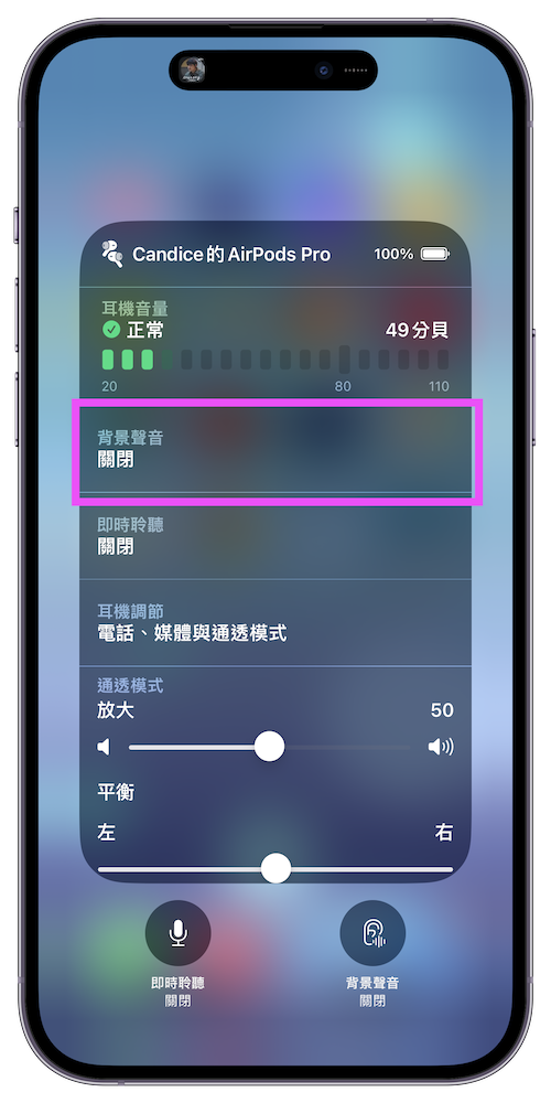 步驟 3. 除了可以單獨在睡覺、泡澡等想要放鬆的情況下開啟白噪音之外,就算我們在透過 AirPods 聽音樂、廣播、學習內容時,也能使用白噪音來當作背景音,還能分別控制耳機和背景聲音的大小聲。