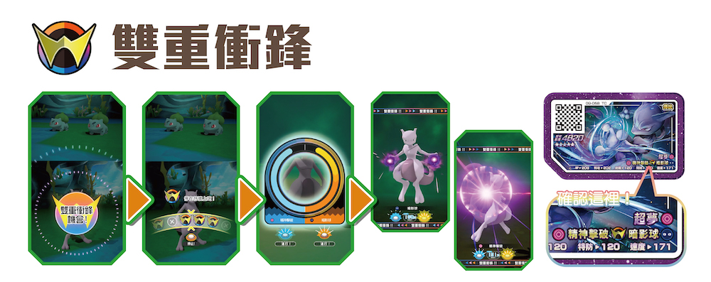 自「Rush系列」開始,遊戲除了導入全新遊玩機能「雙重衝鋒」,「超夢」、「索爾迦雷歐」、「露奈雅拉」等可使用「雙重衝鋒」的強力加傲樂卡匣也將於遊戲中登場。在對戰中的第一次攻擊會有「雙重衝鋒機會」,玩家只要成功讓輪盤停在雙重衝鋒符號上,並連打按鈕集滿招式的計量條,寶可夢會接連使出2種不同的招式,在一次的攻擊中便可帶給對手強大的傷害,強度帥氣兩者兼備。