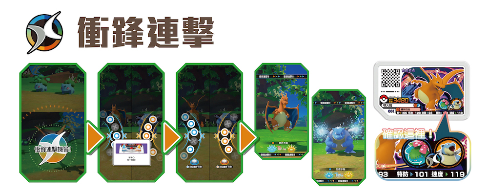 從「Rush 1彈」開始,「妙蛙花」、「噴火龍」、「水箭龜」等可使用「衝鋒連擊」的等級4卡匣將陸續登場。玩家在對戰中將特定的兩張卡匣一同使用並成功發動「衝鋒連擊機會」的話,在一次的攻擊中兩隻寶可夢將進行連擊,透過連擊可帶給對手強大的傷害。