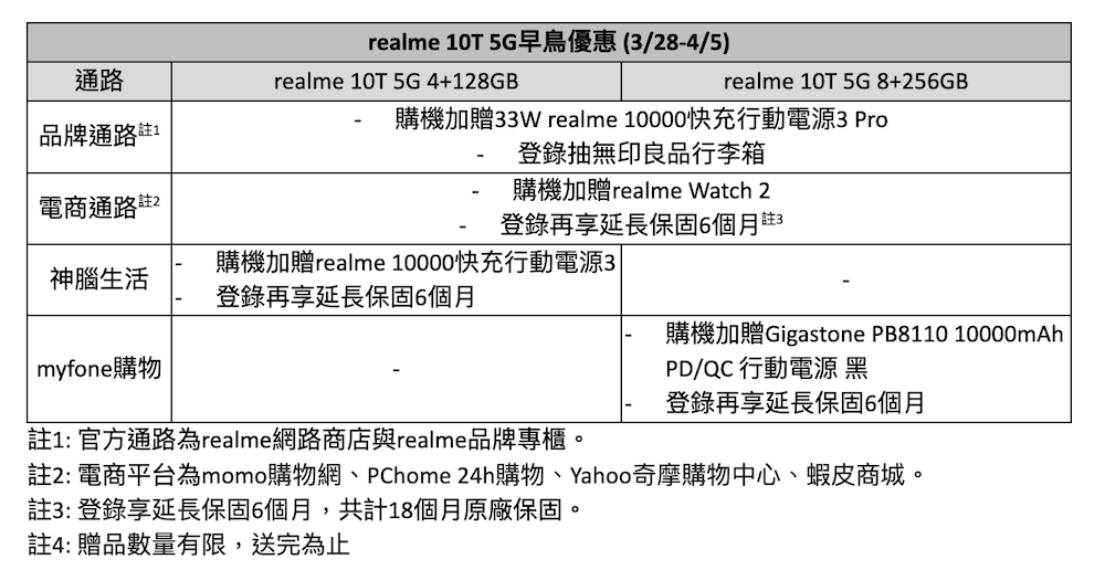 realme 10T 5G 推出潘朵拉藍、深空黑雙色,4+128GB 版本售價 $7,490,8+256GB 版本售價 $8,990 。雙版本將於 3 月 28 日陸續開賣,購買可至 realme 品牌專櫃、realme網路商店、momo購物網、PChome 24h購物、Yahoo奇摩購物中心、蝦皮商城、神腦生活、myfone購物,3 月 28 日至 4 月 5 日首波購機再享早鳥優惠。電信通路則將於 3 月 31 日上架,4+128GB 版本由中華電信、亞太電信販售,搭配指定資費方案,新機 0 元起;8+256GB 版本則由台灣大哥大獨家販售,月付 $799,即可 0 元入手。