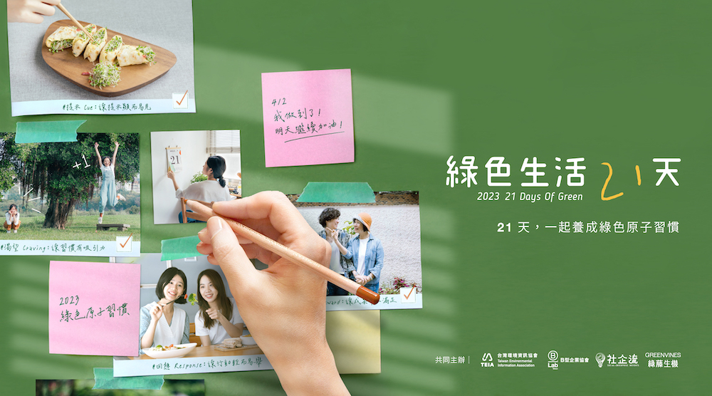《原子習慣》中提到「每天進步 1%,持續一年你能獲得 37 倍成長;每天退步 1%,持續一年你會弱化,甚至倒退到零;你的一點小改變、一個好習慣,都會產生驚人的加乘效應」,2023 綠色生活 21 天,將於 3 月 30 日至 4 月 19 日期間展開。每天會邀請網友嘗試一個簡單的綠色行動,每年綠行動會依環境趨勢而推陳出新,例如第一天開跑的「寫下你的環境永續身份認同」、「問問 ChatGPT,一個關於循環原料的故事」、「練習一次:關於洗手的減法」,到與跨產業的企業與組織,共同倡議在生活中實踐綠色行動。例如,與社企流共同倡議「探索自己的永續素養等級」,透過「永續素養調查」評分表,了解自己對環境永續的素養程度;「花三分鐘,認識生活中友善環境的標章」,則是以即將宣布推出全新「 i 價值標」的家樂福為例,將賣場轉變為永續教室,讓每個人都可以讓責任消費變為日常行動;抑或是到全台已導入 400 店「循環杯」的全家便利商店響應參與,透過租借循環杯減少一次性杯材使用。