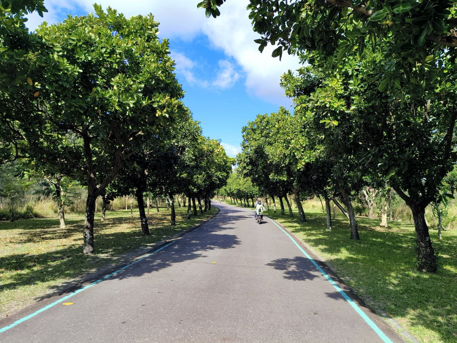 ▼自行車道平緩大條,穿越木麻黃林與多種不同林木,感覺輕鬆又自在!