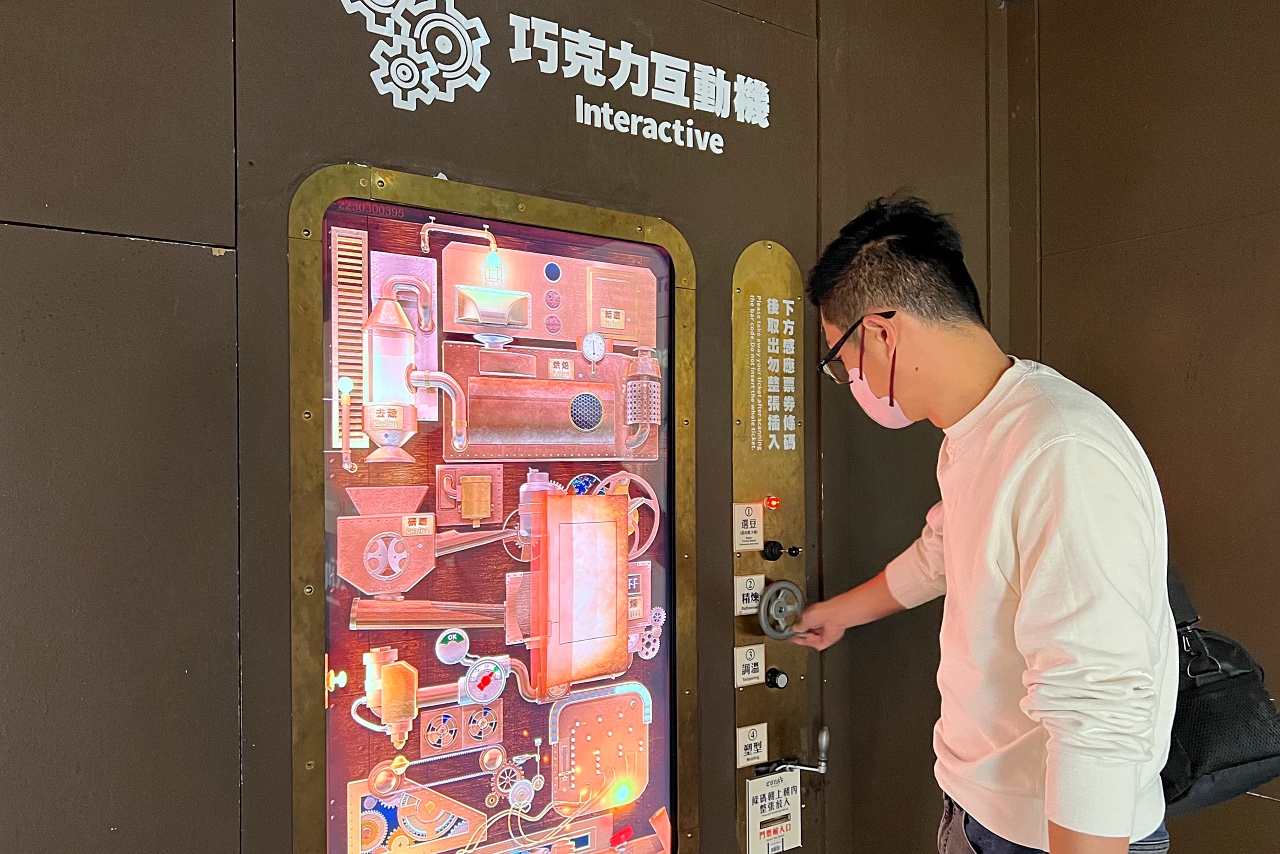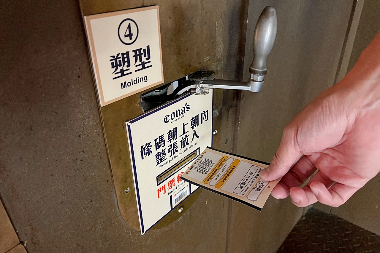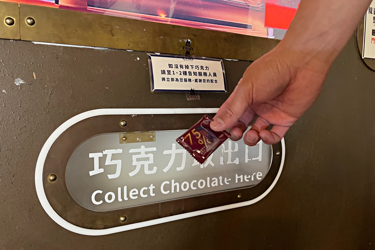 三樓最受歡迎的巧克力互動機正在排隊中,只要憑門票就可以插卡開始玩遊戲囉。機器上會開始說明巧克力的製作從選豆、精煉、調溫、塑型等程序,就能生成完美的巧克力囉!只要跟著螢幕指示,最後會掉出一片75%黑巧克力。這個大人小孩都很風靡。一張門票可以玩一次,別錯過了。