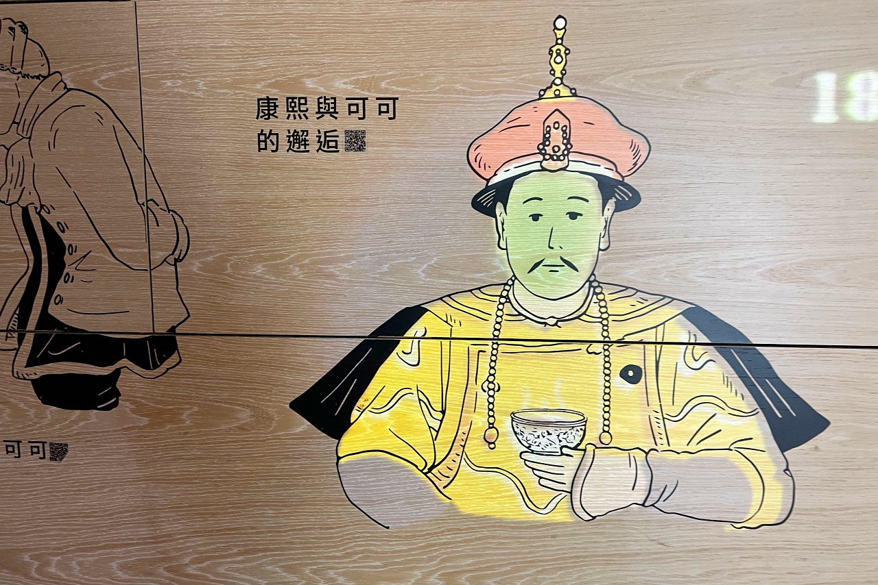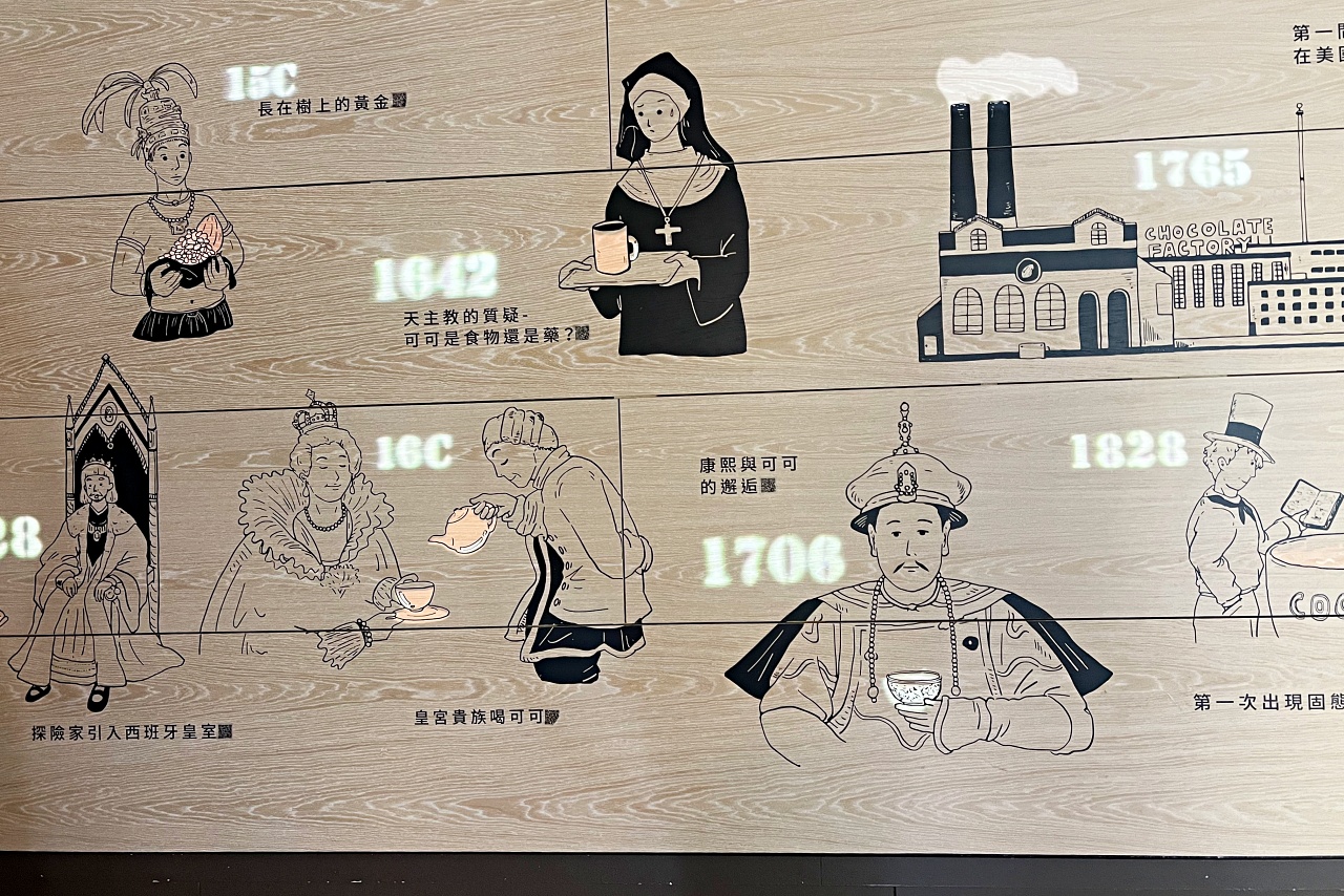 可可的起源早在好幾世紀以前就發生了,可以回溯到15世紀的中美洲,當時的馬雅人已經懂得用乾燥的可可豆製作巧克力飲品,是不是很令人驚訝?這一面知識牆把傳統觀光工廠的圖文介紹方式變得更加生動有趣,應用光雕投影方式,可可的起源和發展歷史刻劃在光雕互動牆面上,並用互動方式透過觸摸產生投影變化,看看圖片上的康熙臉都綠了,就知道他對於可可接受度不高。