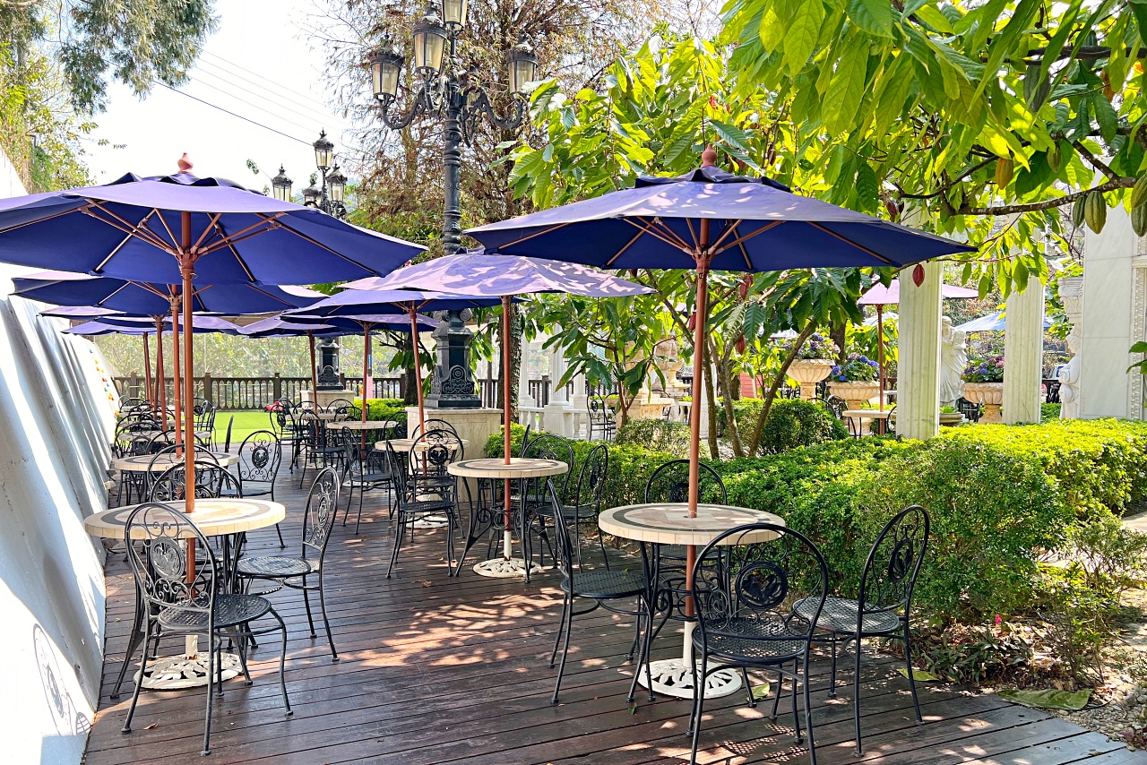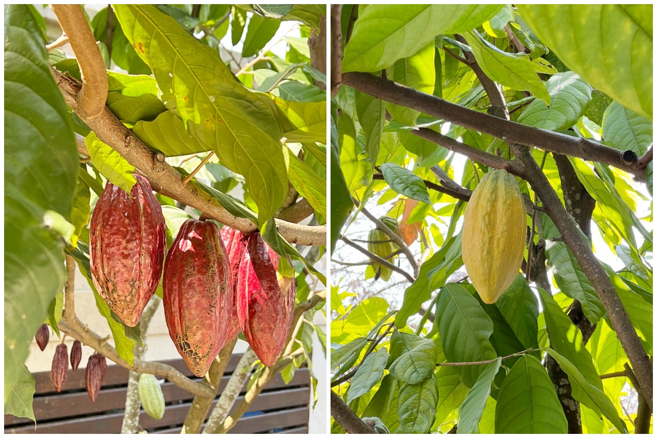 ▲城堡的戶外園區規劃有露天座位區,周圍更是種植了可可樹,讓客人可以親眼目睹製作巧克力的原料來源「可可樹」的生長過程。可可豆的外殼顏色有赭紅、鮮黃、深咖啡…好奇特的果實啊!