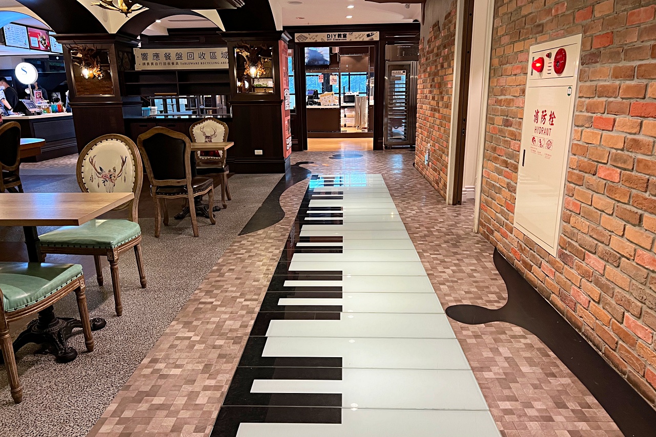 DIY教旁邊有一區廣大的休憩區,讓遊客可以坐下來好好品嚐Gelato義式冰淇淋或是喝個飲品解渴。比較有趣的是地上的鋼琴造型步道是真的可以發出琴聲的互動區,小朋友踩在上面都玩的好開心。