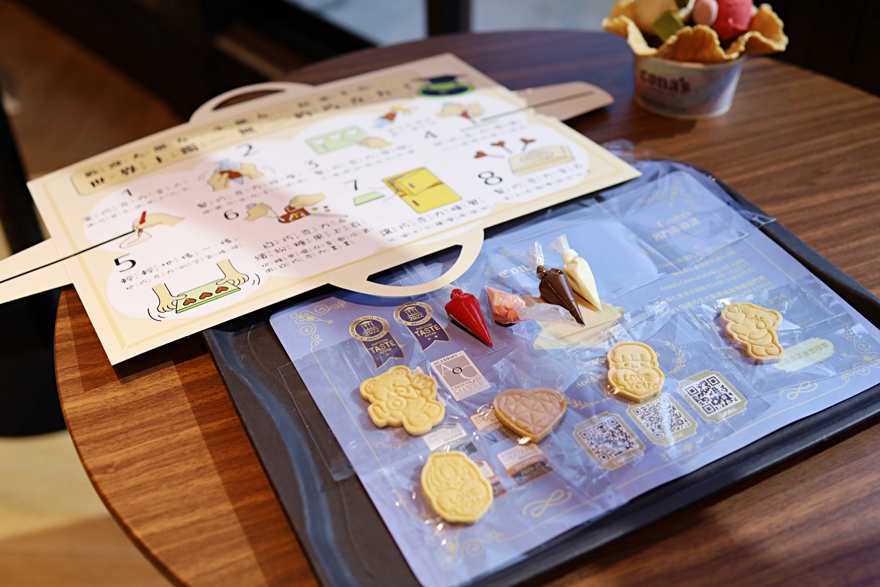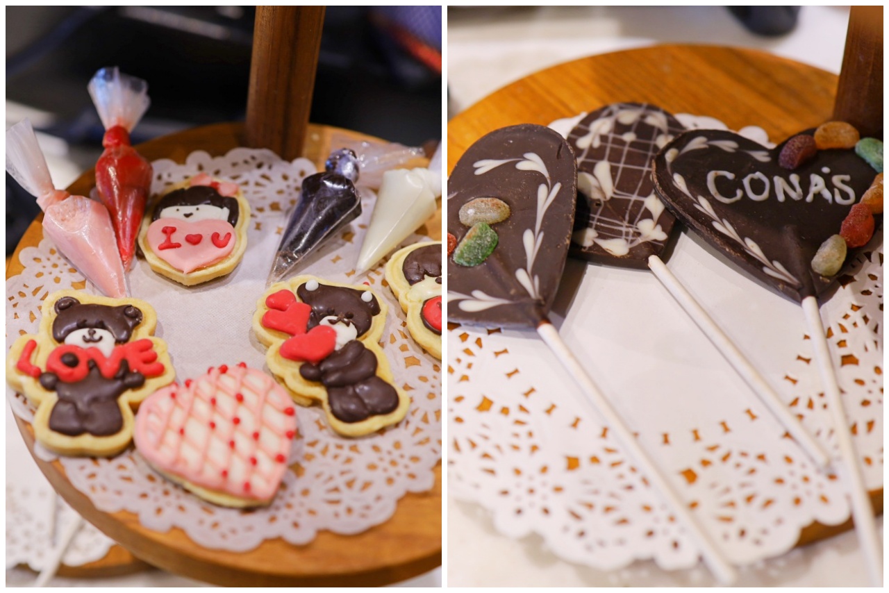 這裡提供有趣的DIY體驗,有巧克力棒棒糖DIY、節日推出的限定DIY。我們來的時候剛好是接近情人節,就選了情人節限定的巧克力餅乾DIY。餅乾造型很可愛,有愛心、熊熊,這個都已經先烤好了,只要把多色的巧克力醬塗枺在餅乾上頭,做出屬於自己喜愛的巧克力造型餅乾,再送進冰箱冷藏讓巧克力定型,就大功告成啦。